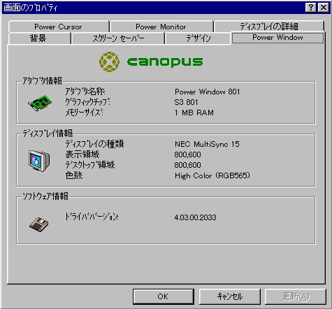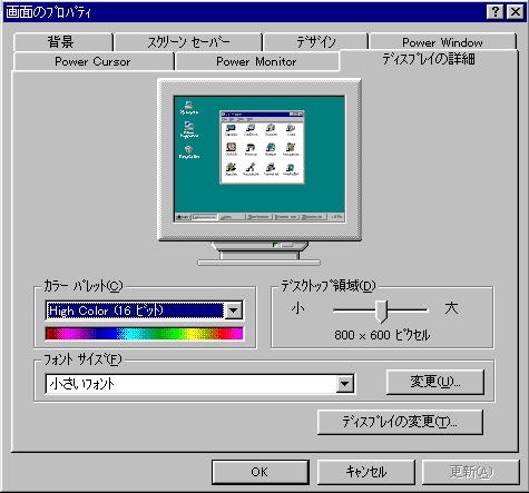 画面・画質設定はカラーパレット『16 ビット』、デスクトップ領域『1024 X 768』まで設定できます。現在はカラーパレット『16 ビット』、デスクトップ領域『800 X 600』に設定しています。