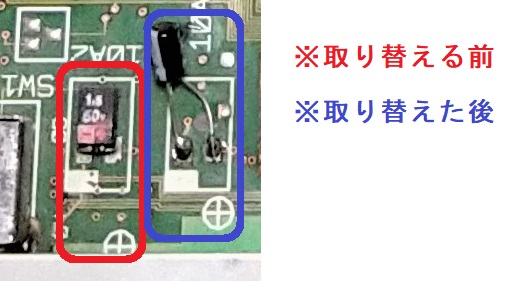 下の画像は取り外したコンデンサと新しく取り付けるコンデンサの画像です。