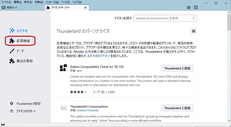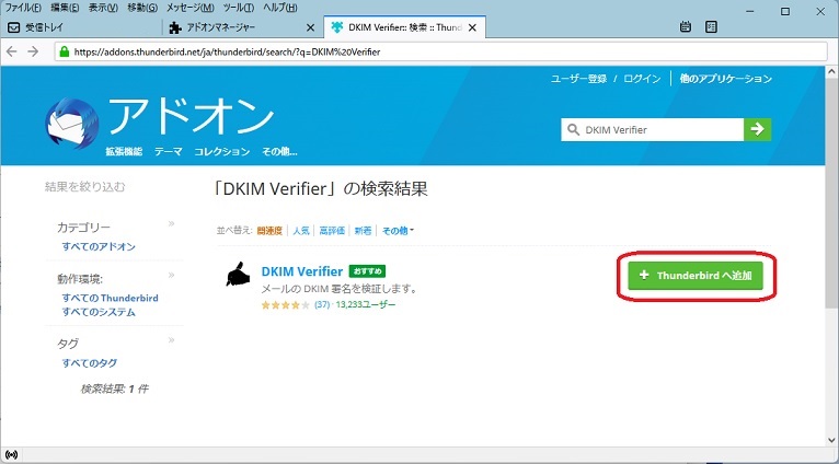 3.“DKIM Verifier”を確認し「+Thunderbirdへ追加」をクリック