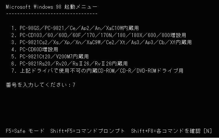 起動メニューの7番の NECCDM.SYS は、ほとんどのIDE接続のCD/DVDを認識・使用することができます。